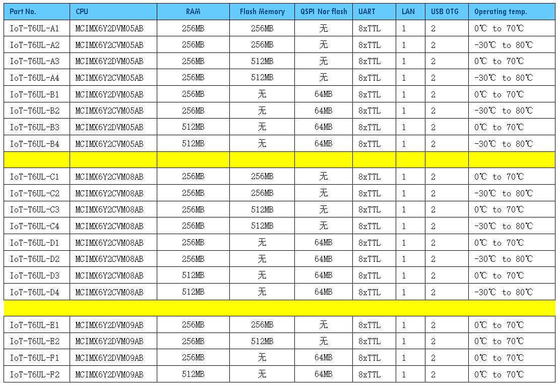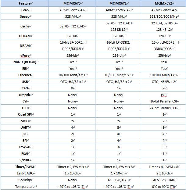 I.MX6UL/L CPU列表及功能區(qū)別: