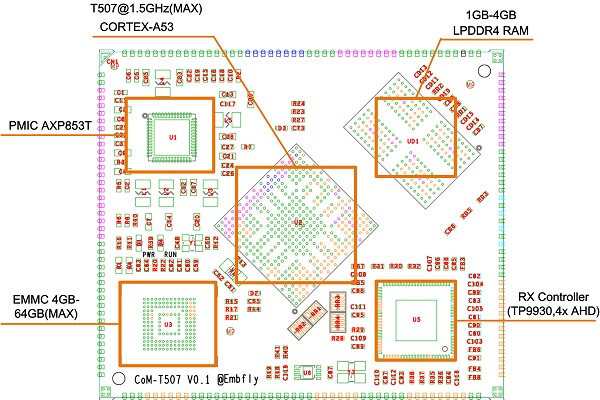 - 專為車載視頻監控設計,板載RX支持4路AHD信號輸入(RX為Techpoint TP9930)。