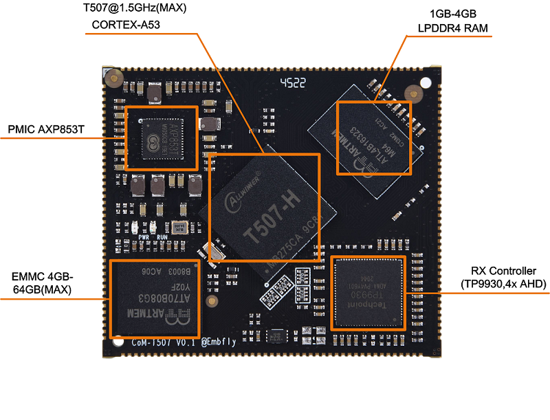 - 采用Allwinner公司Cortex-A53四核T507車規級處理器,運行最高速度為1.5GHZ;