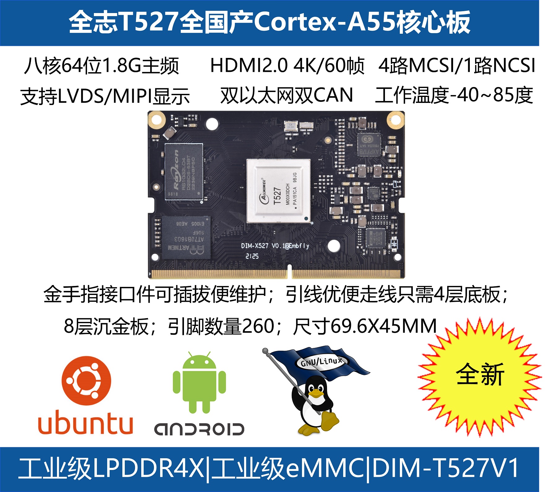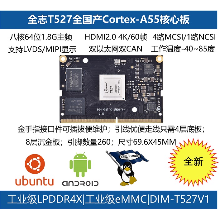 ? ? 國產(chǎn)八核處理器T527,支持2x4lanes mcsi/4x2lanes mcsi、雙以太網(wǎng)、雙CAN、支持Android13.0/LINUX 5.15/UBUNTU 22.04