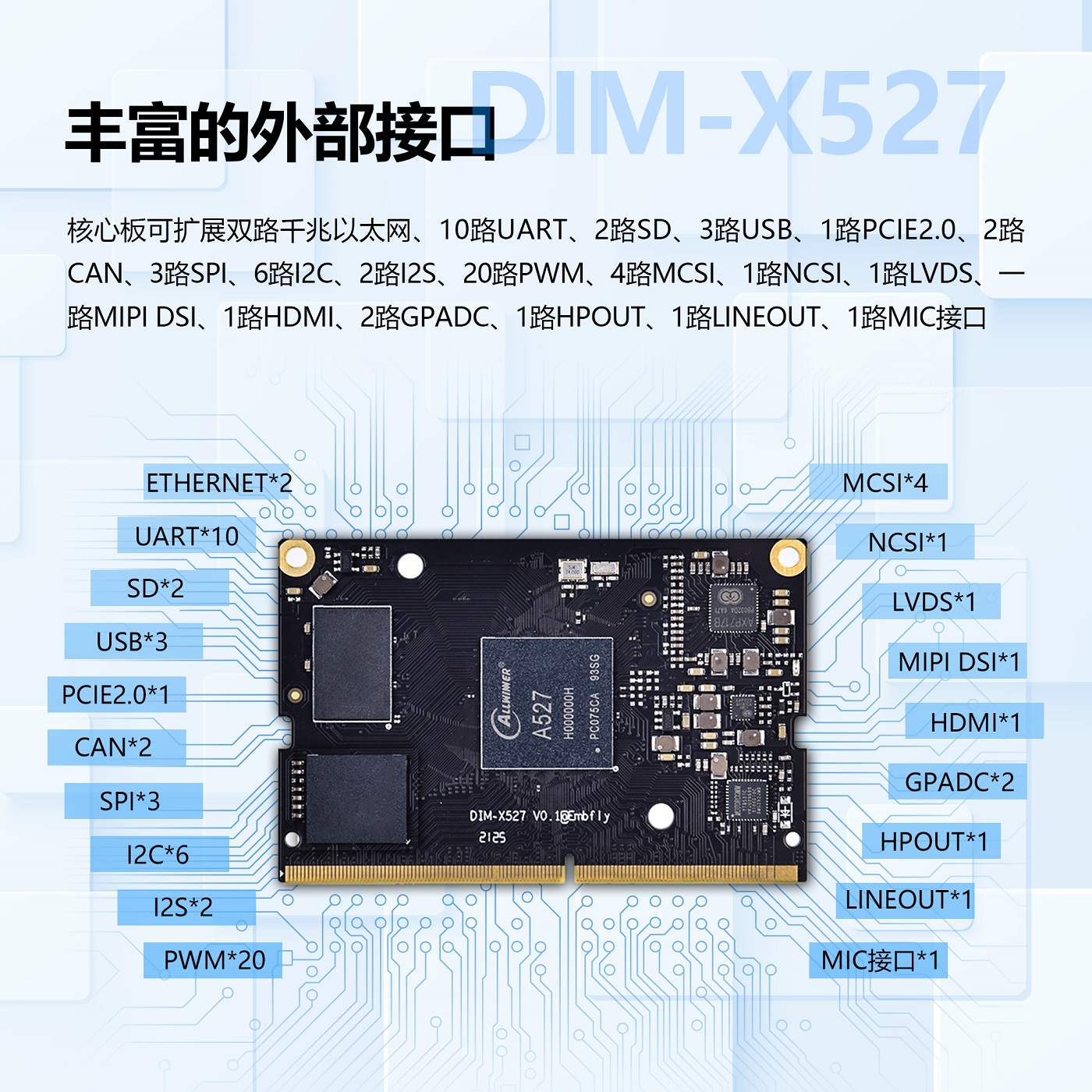 l支持PCIE2.1;支持 10路UART;支持雙路CANBUS;支持雙路千兆以太網(wǎng);