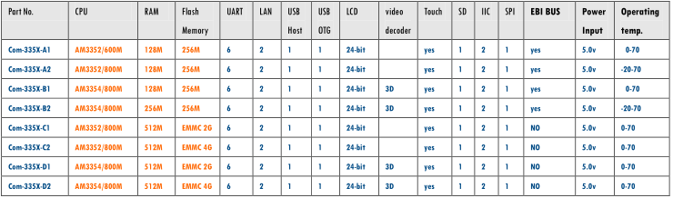 1.處理器采用系列化,從高端過渡到低端,滿足不同行業客戶的各種功能需求,達到性價比最優的微妙平衡。分別有AM3359/AM3358/AM3357/AM3356/AM3354等多款配置參數各不相同的處理器,且系列 處理器管腳PIN對PIN兼容,方便客戶進行產品升級