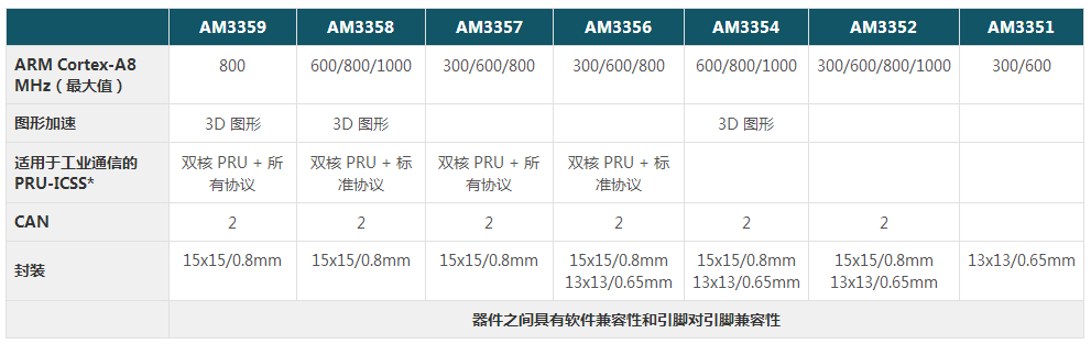 1.處理器采用系列化,從高端過渡到低端,滿足不同行業客戶的各種功能需求,達到性價比最優的微妙平衡。分別有AM3359/AM3358/AM3357/AM3356/AM3354等多款配置參數各不相同的處理